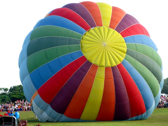 今天很幸運,等到了黃昏風向和風速、溫度都符合升空條件,現場飛行教練開始往氣球裡面噴火,將熱氣灌進去。等了好久,終於有一顆熱氣球站立起來,巨大的熱氣球慢慢升空了,現場觀眾非常興奮。